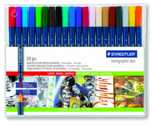 Duo brush-markers. 20 colors of double-ended markers, foam/fine point. Best foam tip on the market, holds it spring & maintains its original shape without fraying. Richly colored dye-based ink blends easily with water for a variety of effects. Duo brush markers foam/fine 20 colors Red, Dark Mauve,Light Blue, Blue, Light Green, Green, Van Dyck Brown, Black, french Green, Cyan, Violet,Bordeaux, Carm
